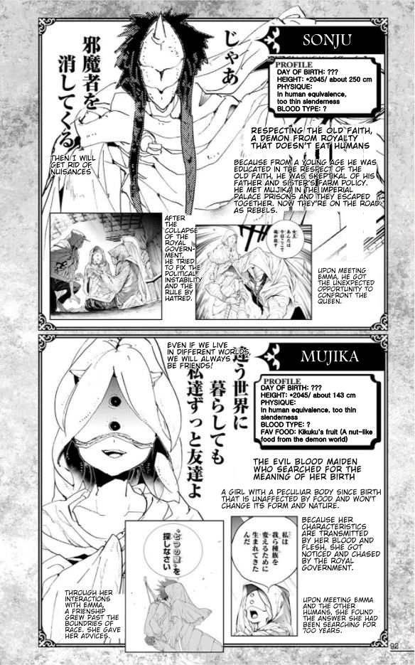 Mujika makes her debut in this chapter. Emma's collapsing due to her ear injury was in the 300-page prototype as well. She was saved by Sonju and Mujika, who she discovered after waking up. Her stay with the heathens was shorter as she was the only escapee.